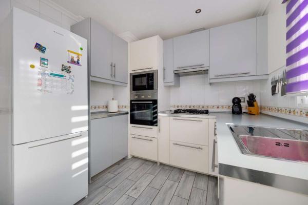 Nemovitost nabízí 3 prostorné ložnice, 2 koupelny a velký obývací pokoj s jídelnou a přímým přístupem do moderní a plně vybavené kuchyně.