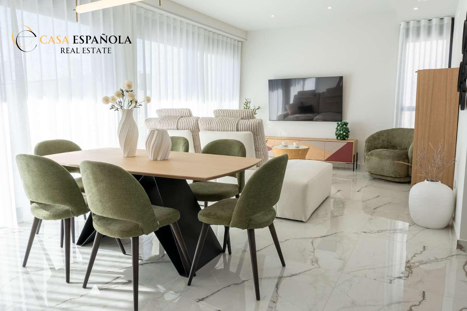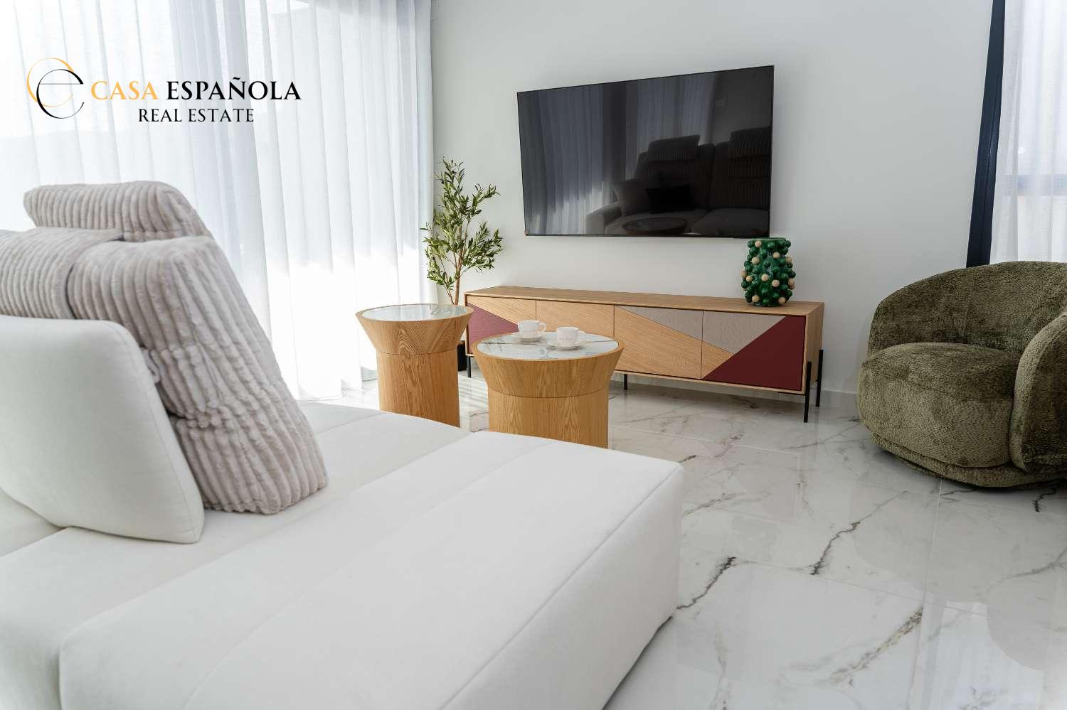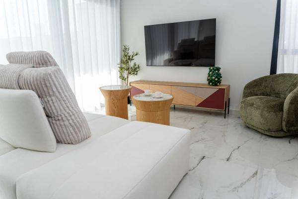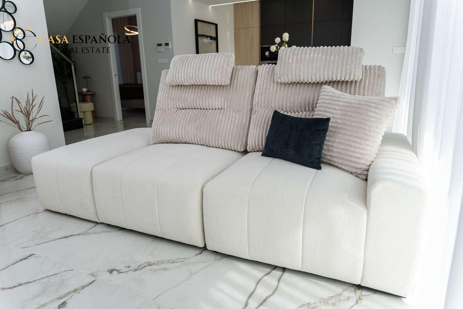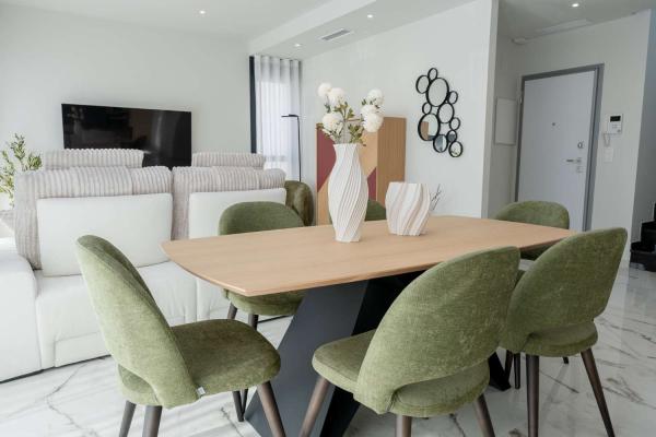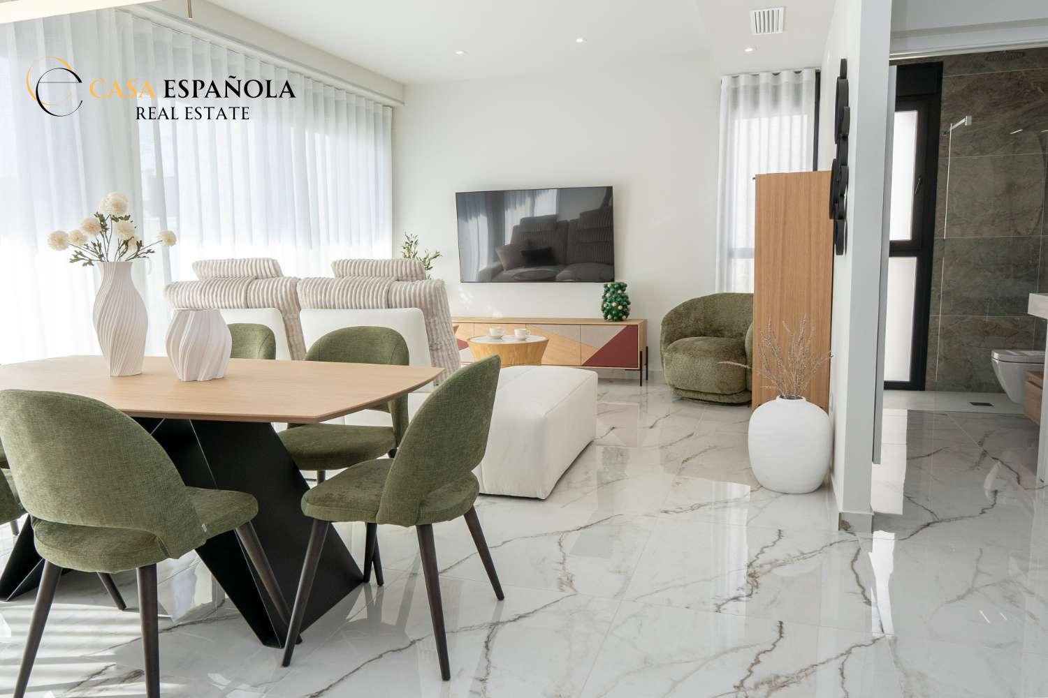 Model Vega nabízí velký obývací pokoj s jídelnou, otevřenou kuchyň se všemi vestavěnými spotřebiči, 3 ložnice a 3 koupelny rozložené na dvou prostorných podlažích s velkým soláriem a upravenými zahradami.