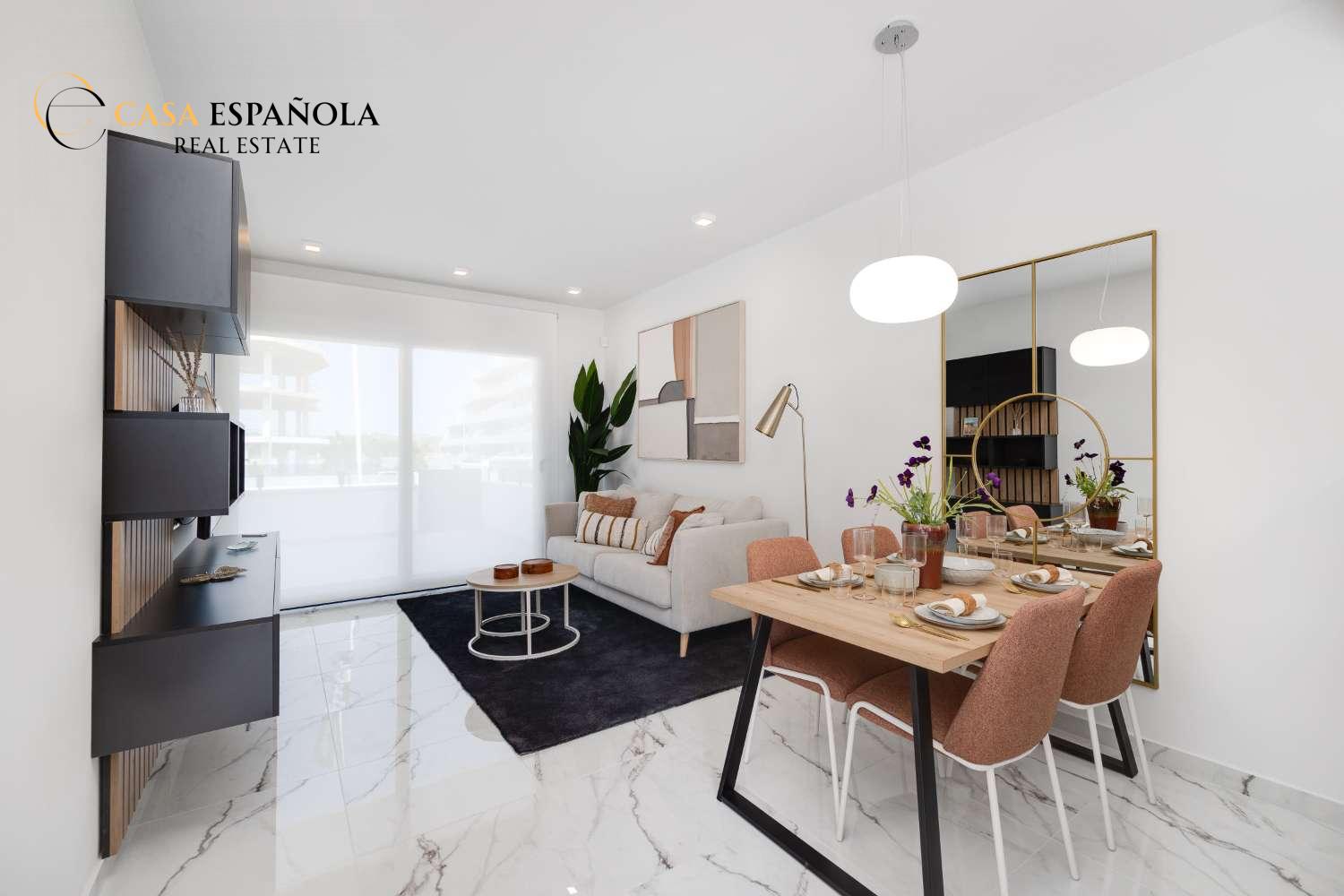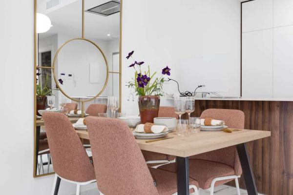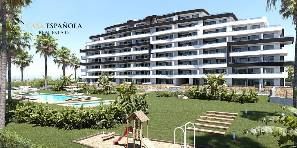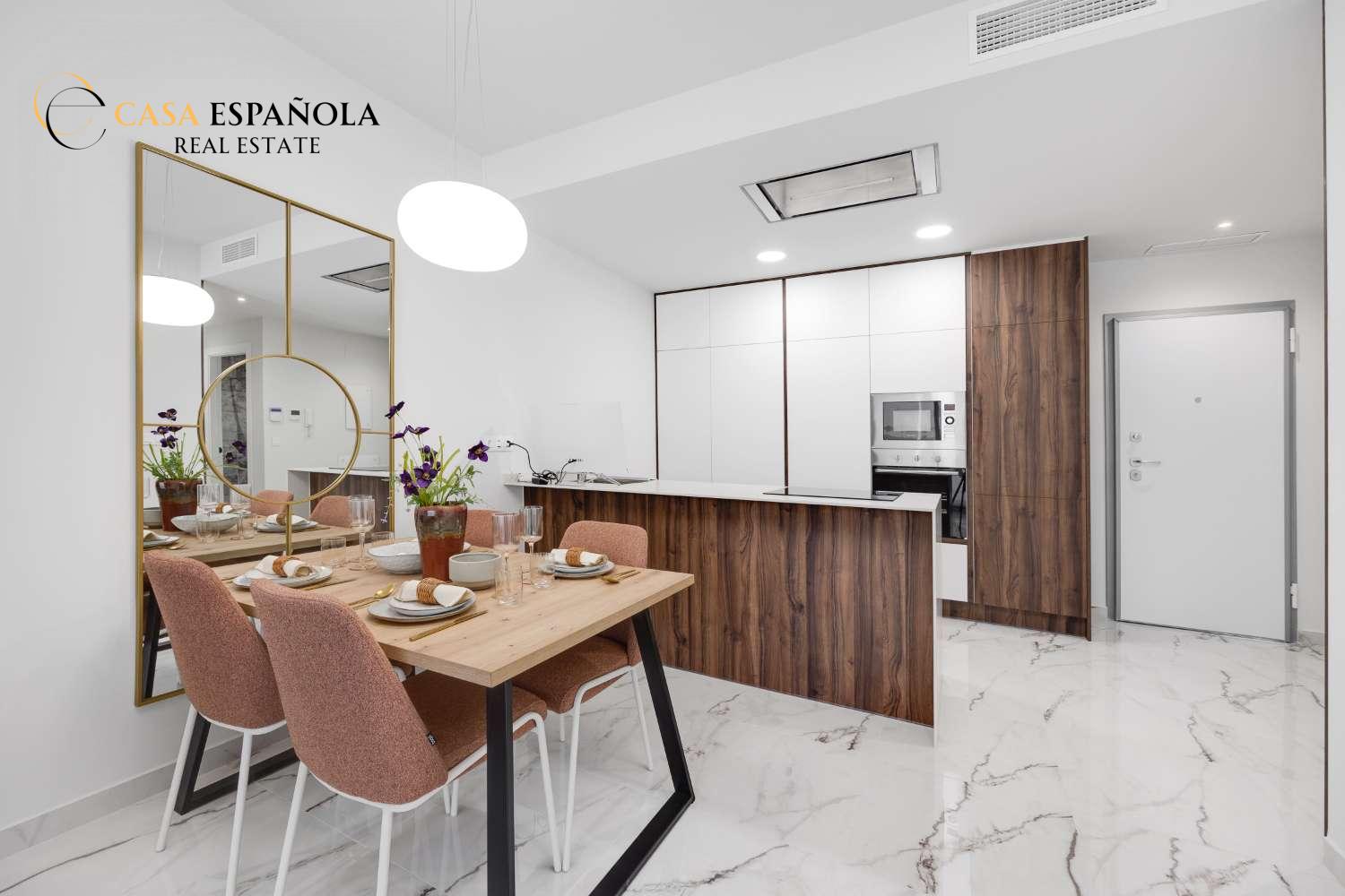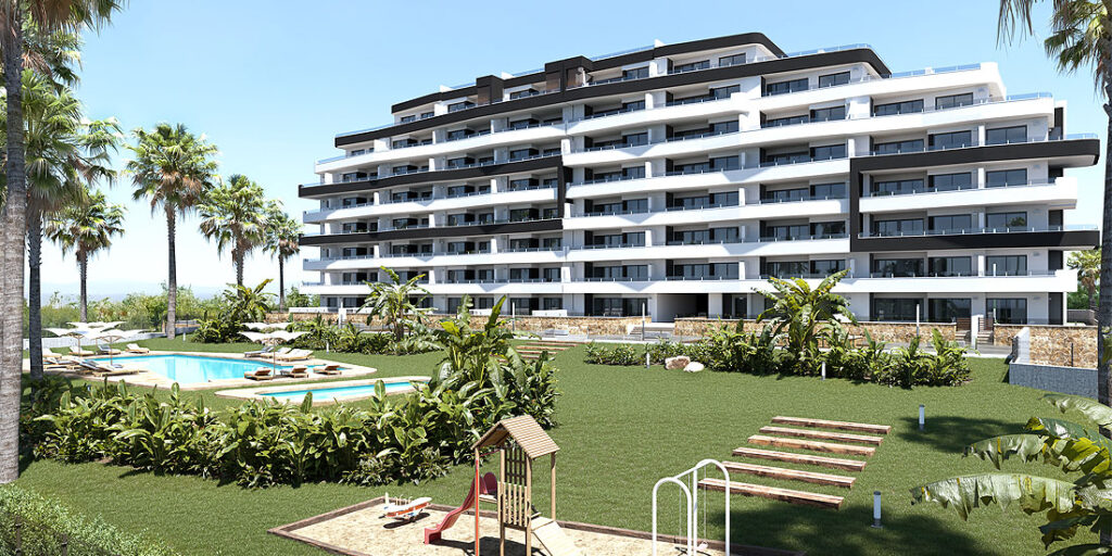 The residential complex comprises 112 two-bedroom, two-bathroom apartments, distributed across a seven-story building with a modern and innovative design in San Miguel de Salinas.