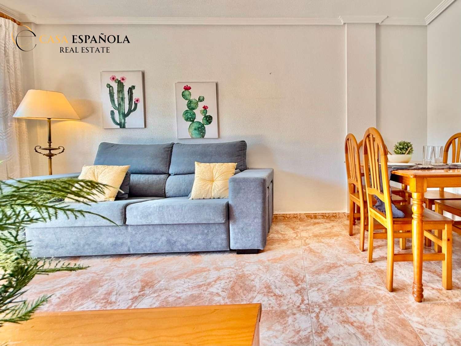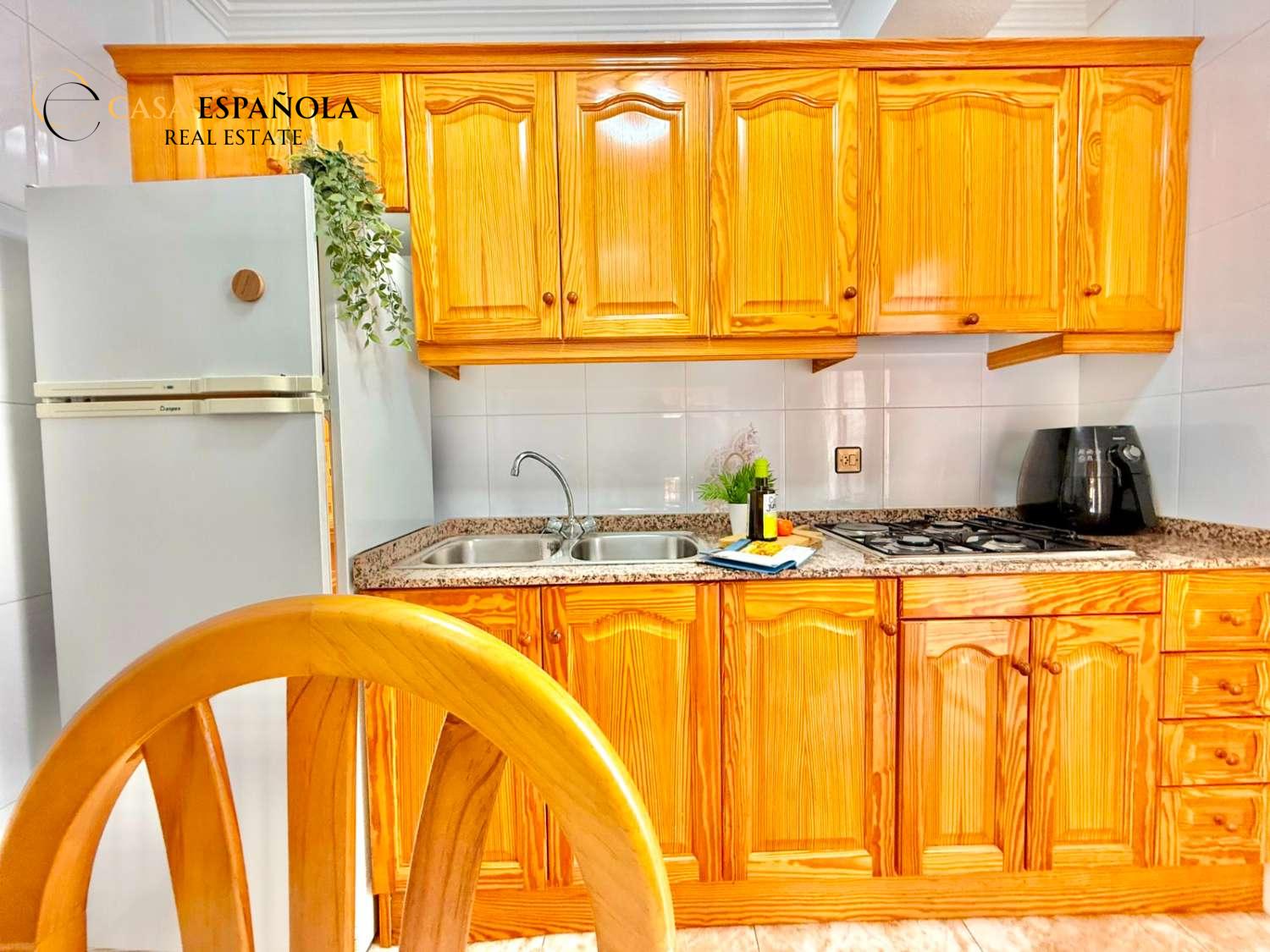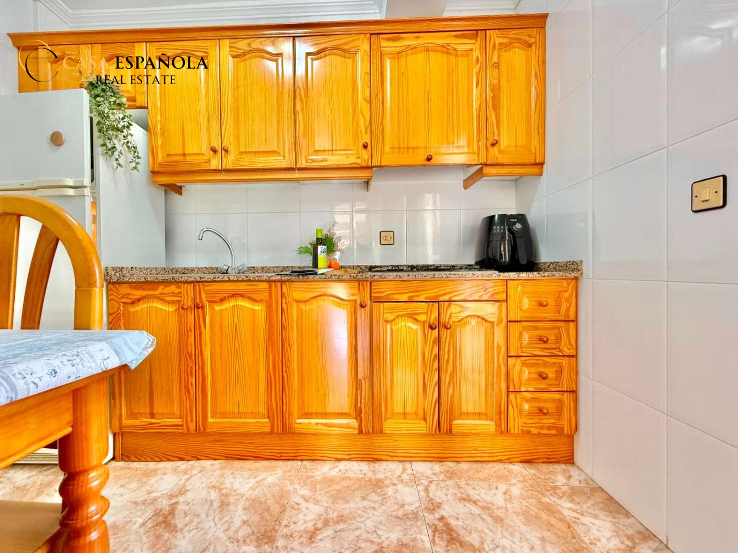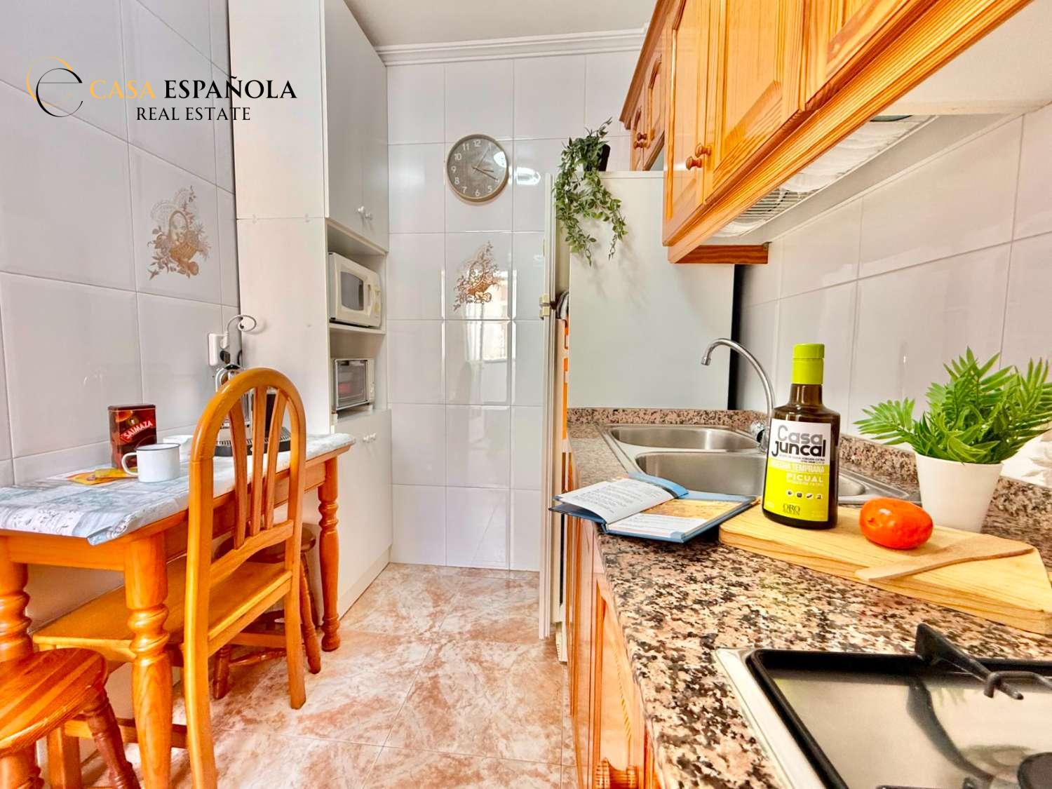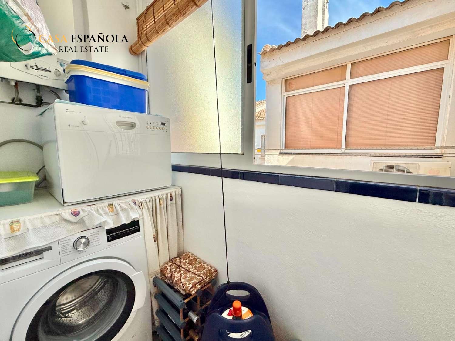The property features a front terrace, a balcony of approximately 4 m², two bedrooms with built-in wardrobes, a bathroom, living area and a practical utility room (lavadero). The kitchen comes equipped with basic appliances, and the property includes air conditioning.