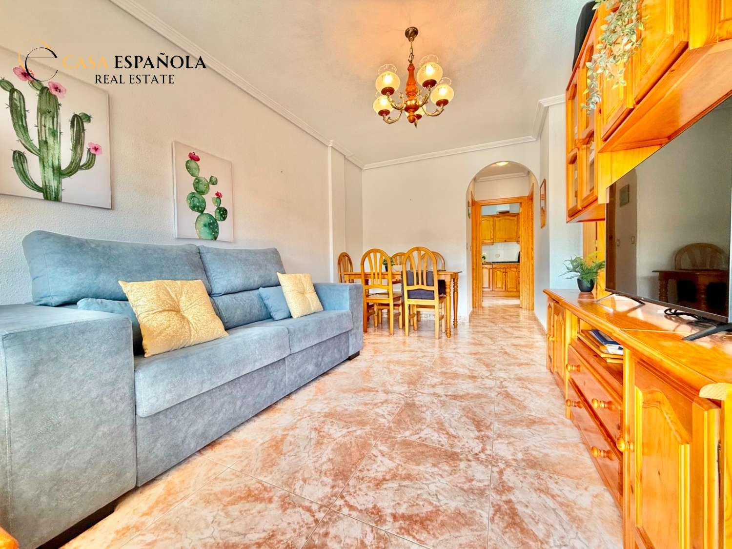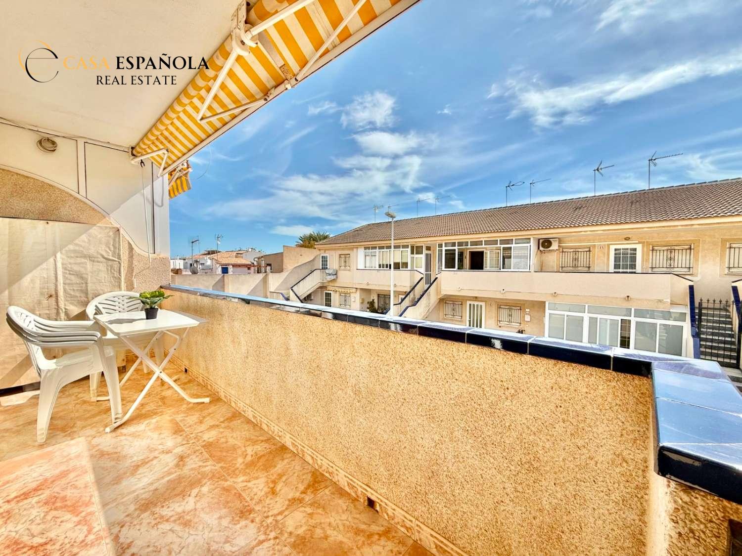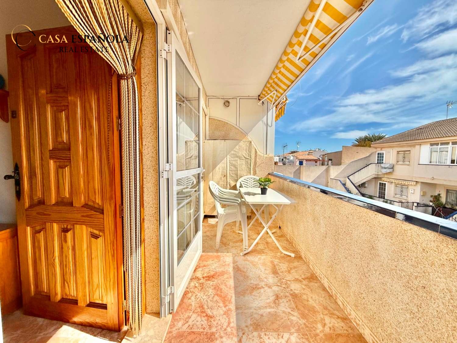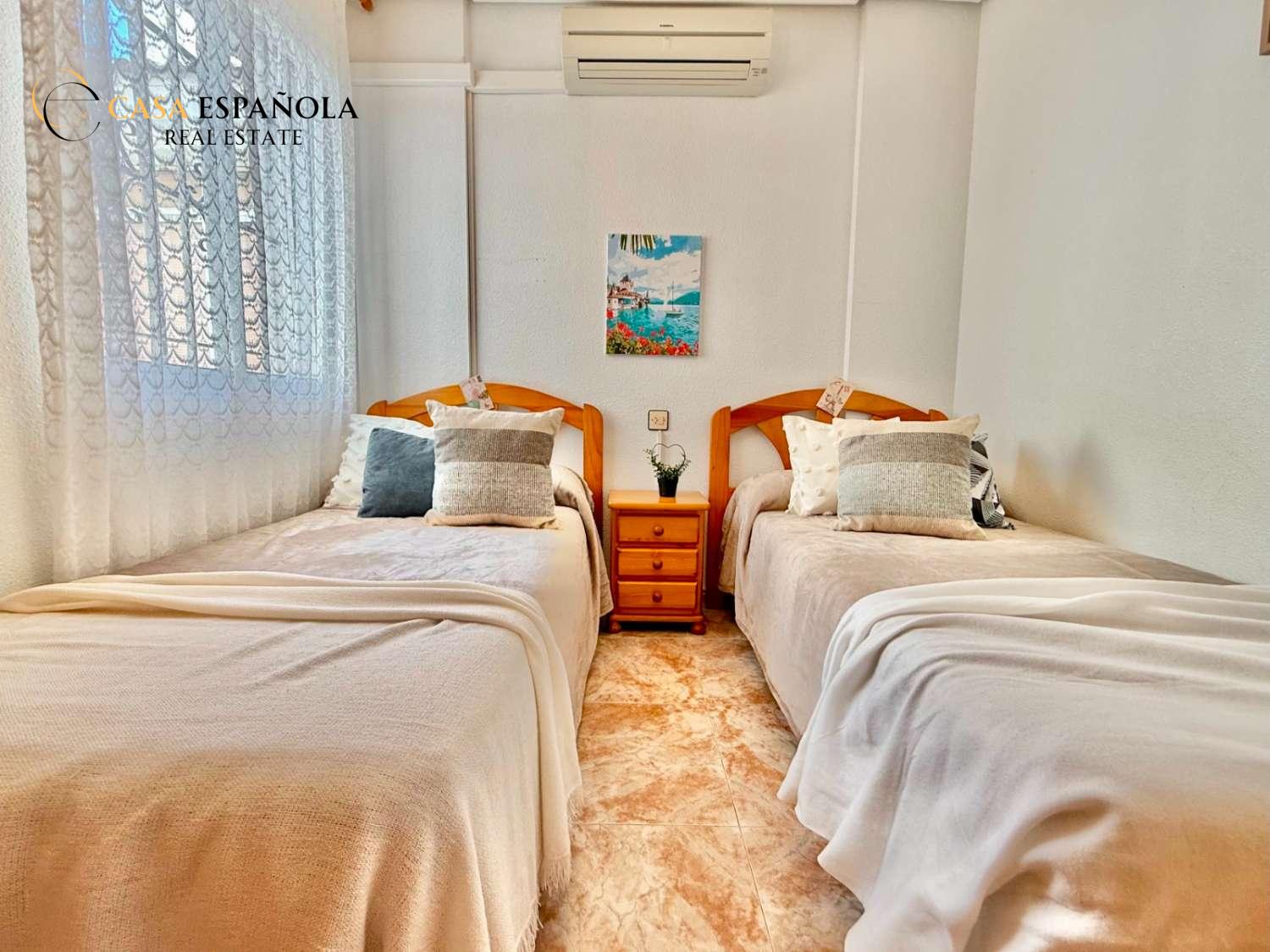 The property features a front terrace, a balcony of approximately 4 m², two bedrooms with built-in wardrobes, a bathroom, living area and a practical utility room (lavadero). The kitchen comes equipped with basic appliances, and the property includes air conditioning.