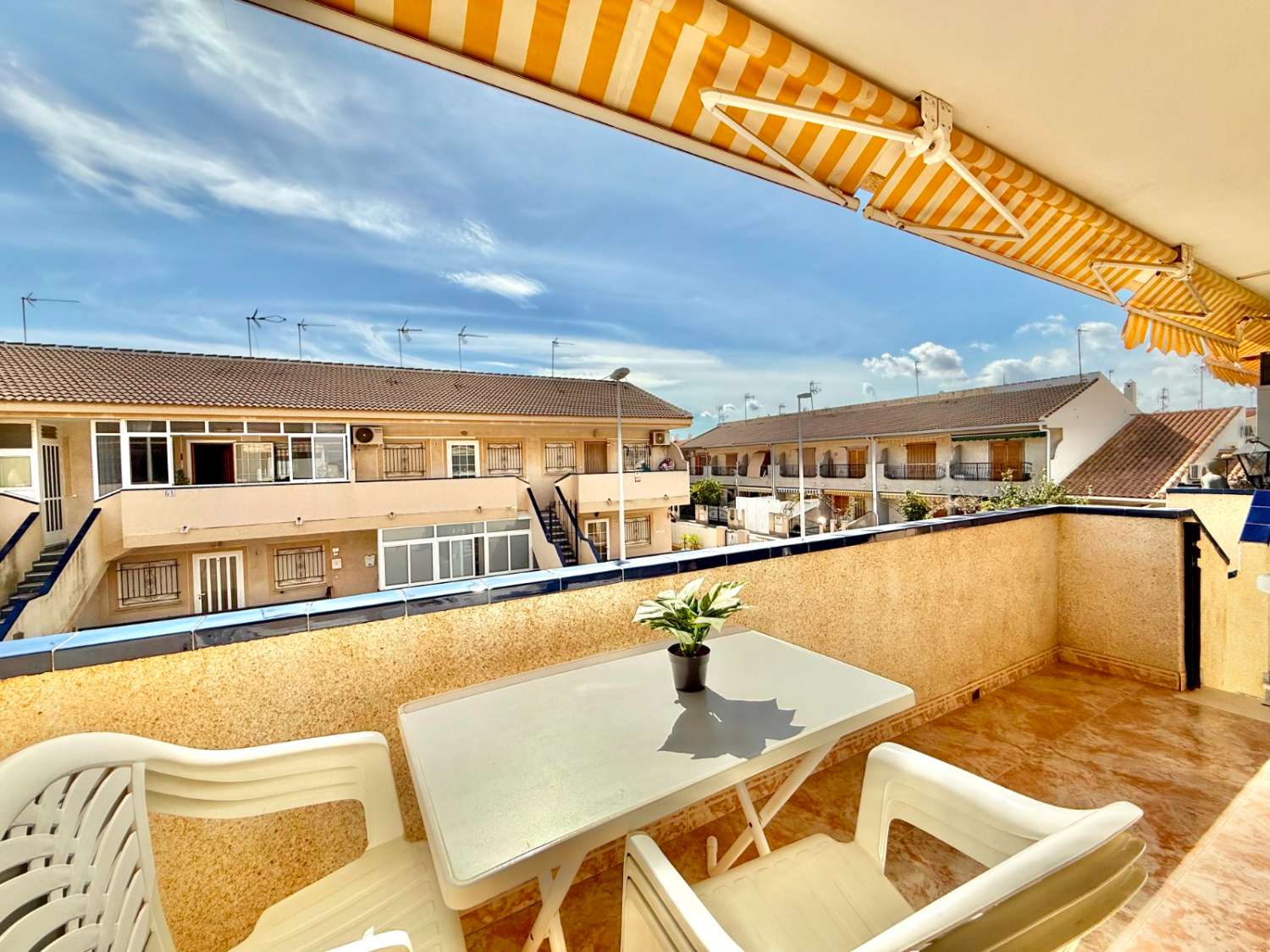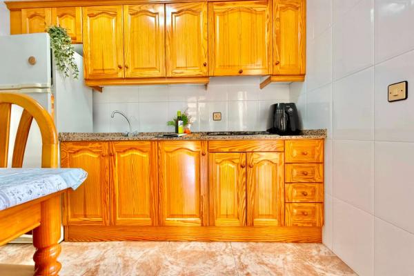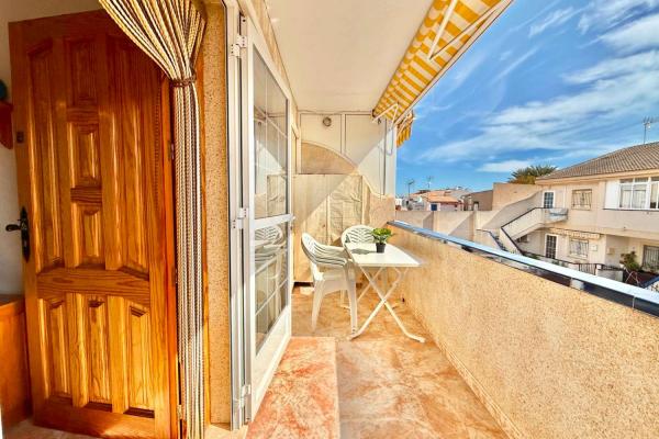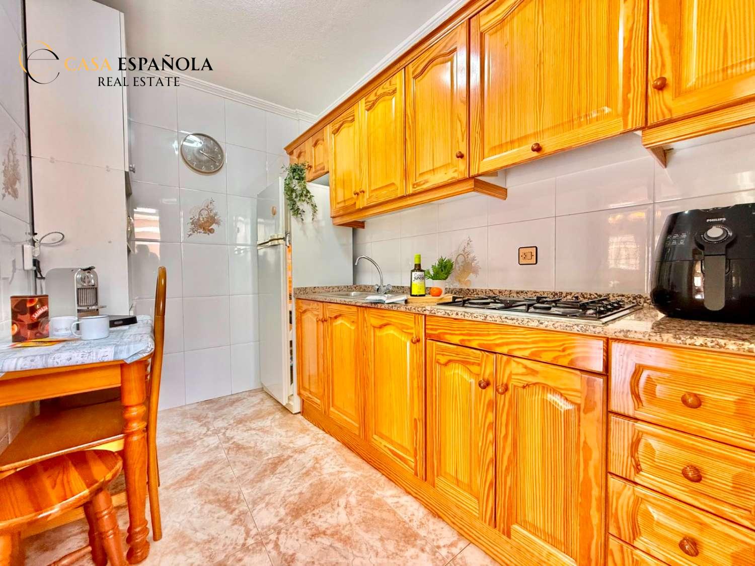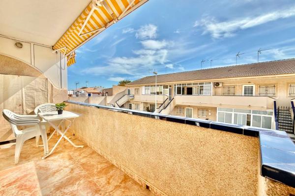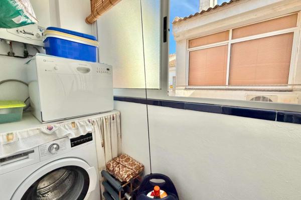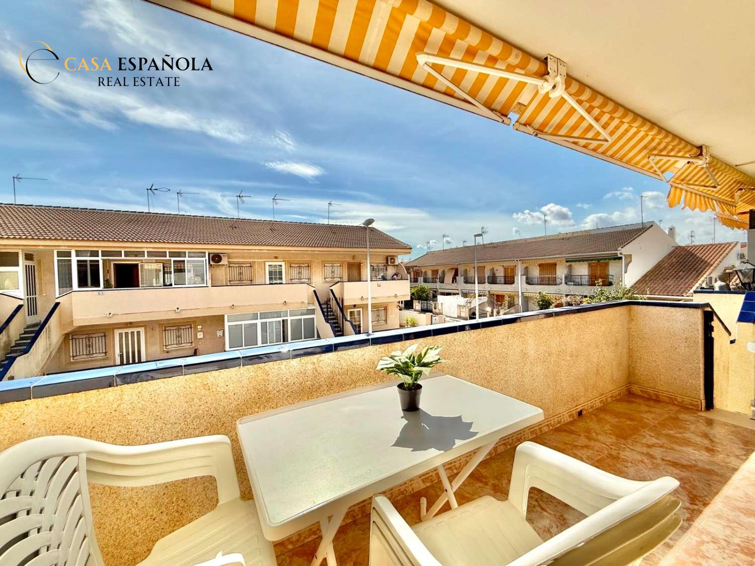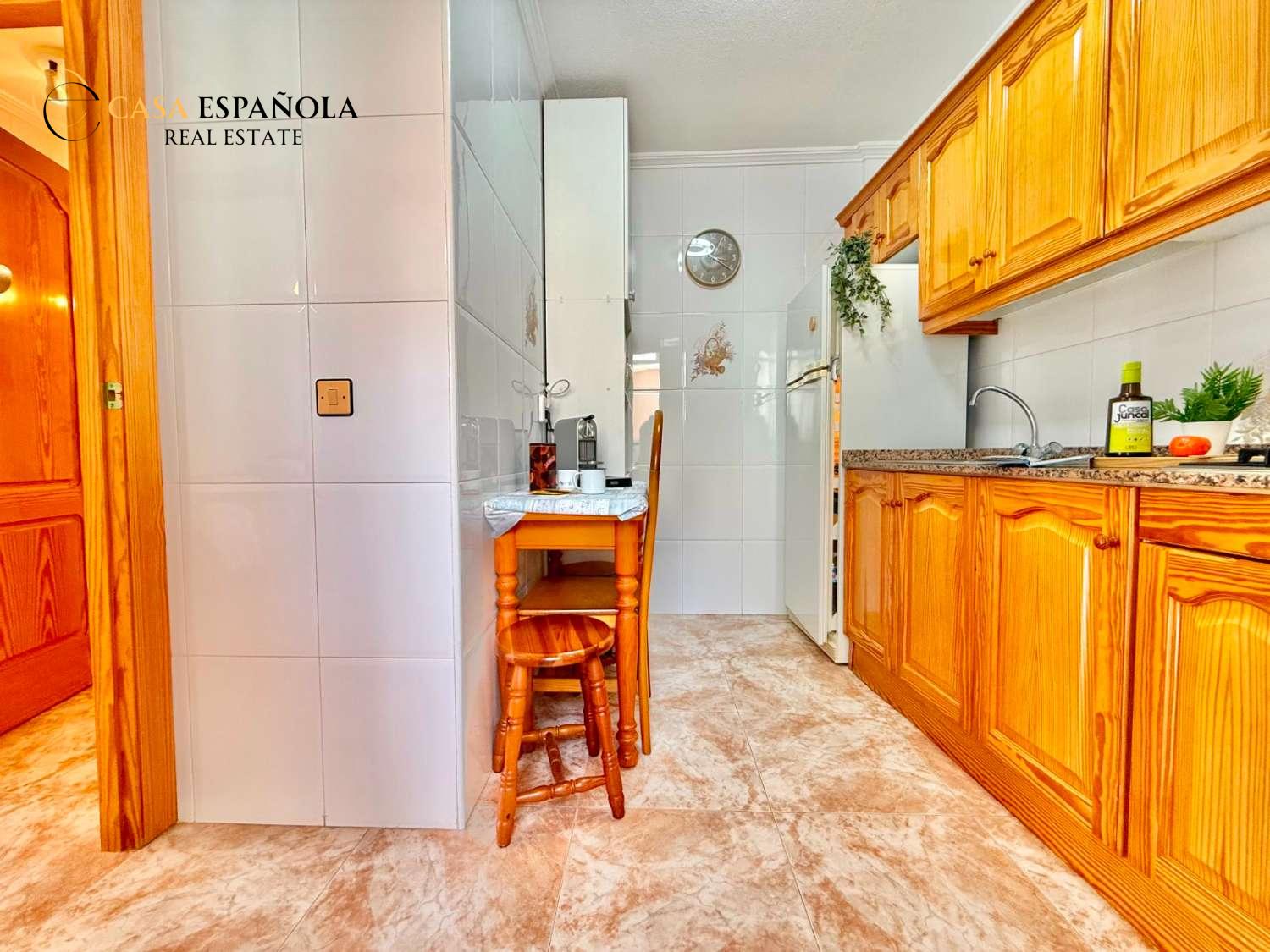 The property features a front terrace, a balcony of approximately 4 m², two bedrooms with built-in wardrobes, a bathroom, living area and a practical utility room (lavadero). The kitchen comes equipped with basic appliances, and the property includes air conditioning.