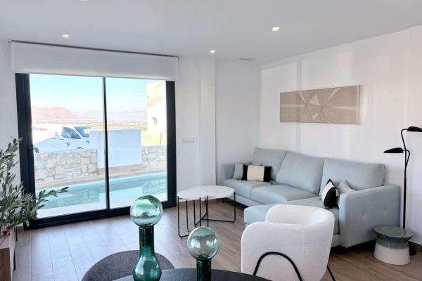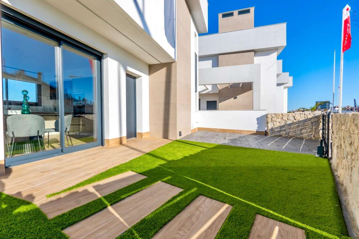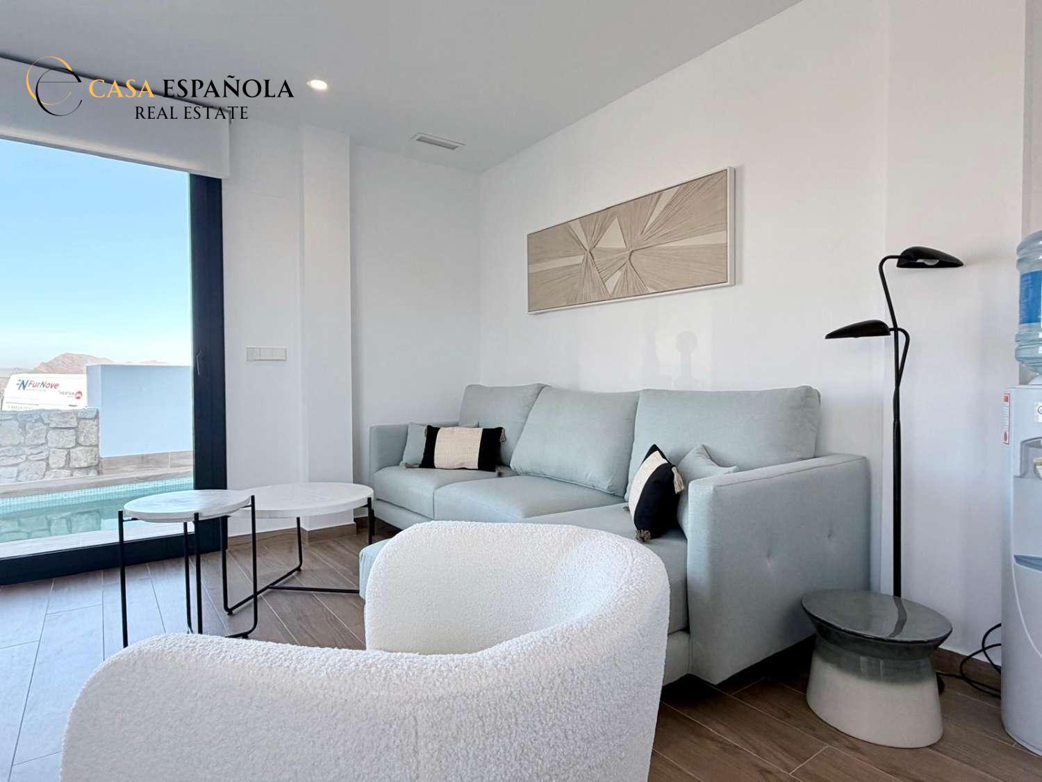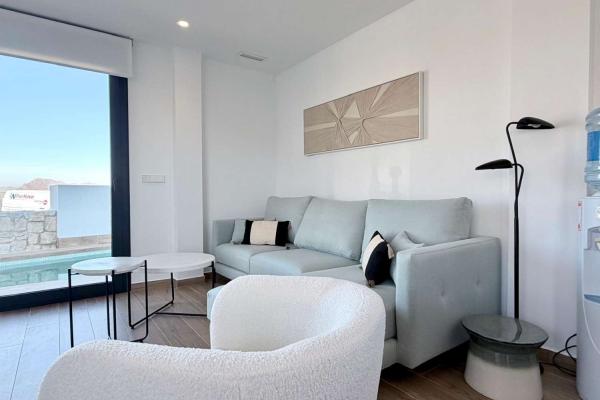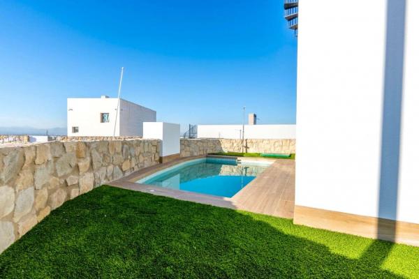 Each villa features its own private garden with swimming pool, outdoor terraces for dining and relaxation, and a rooftop solarium that allows residents to enjoy the sunny Costa Blanca climate throughout the entire year.