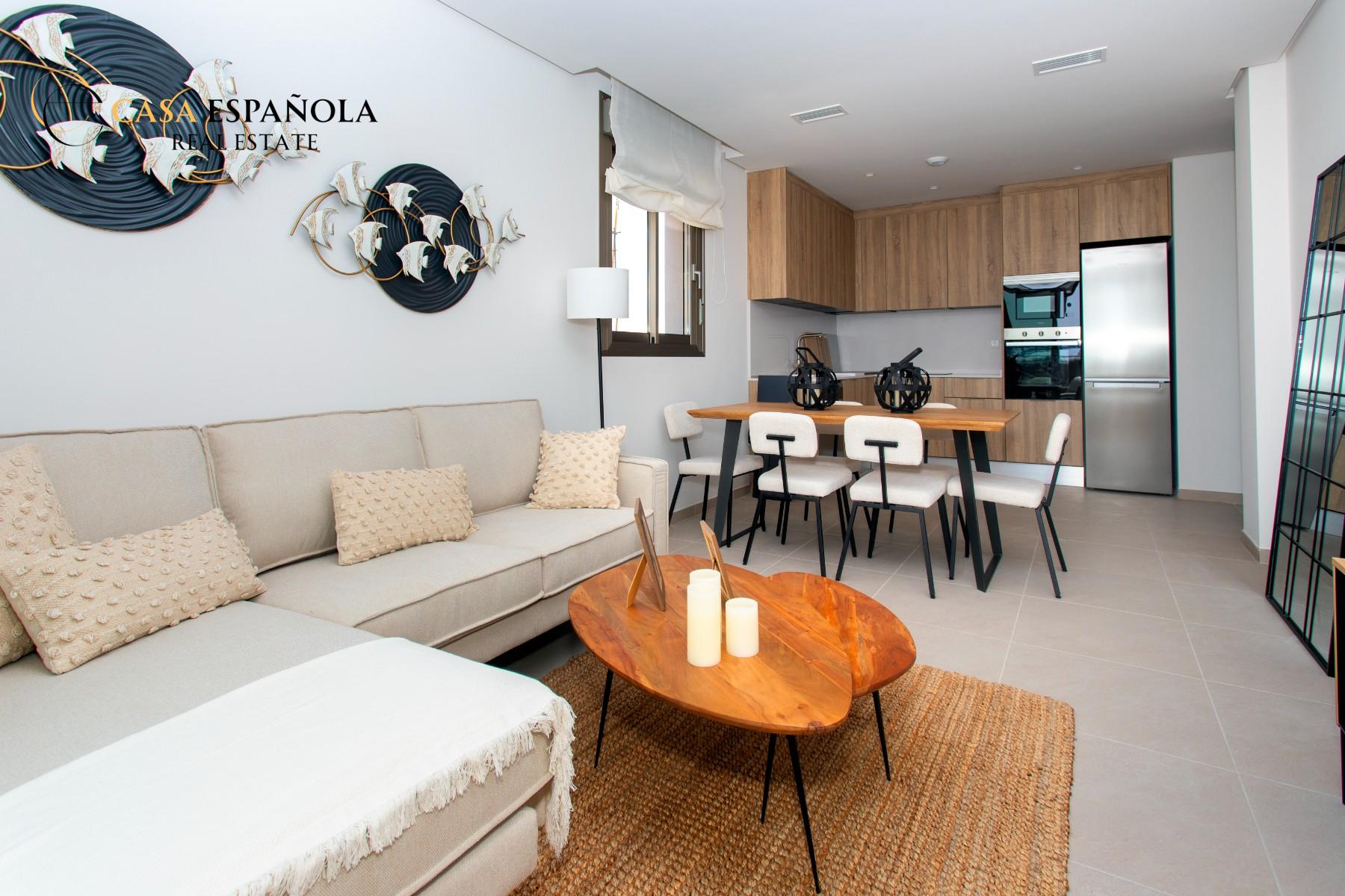Moderno residencial cerrado compuesto por viviendas de 2 y 3 dormitorios y 2 baños completos. El complejo está formado por 3 bloques de apartamentos con amplias zonas comunes ajardinadas que incluyen piscina con camas de agua, parque de juegos infantil, pérgola y aparcamiento para bicicletas.