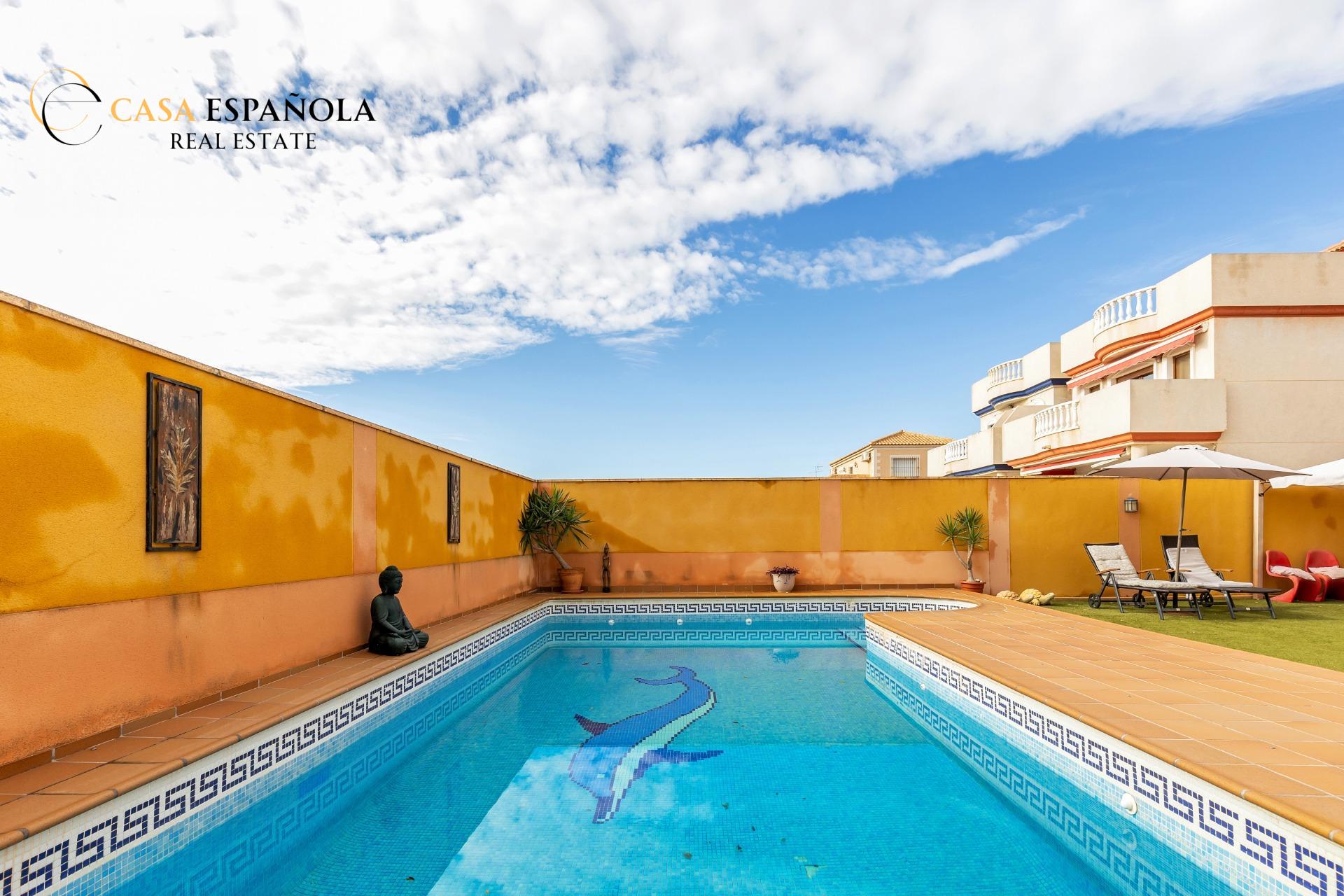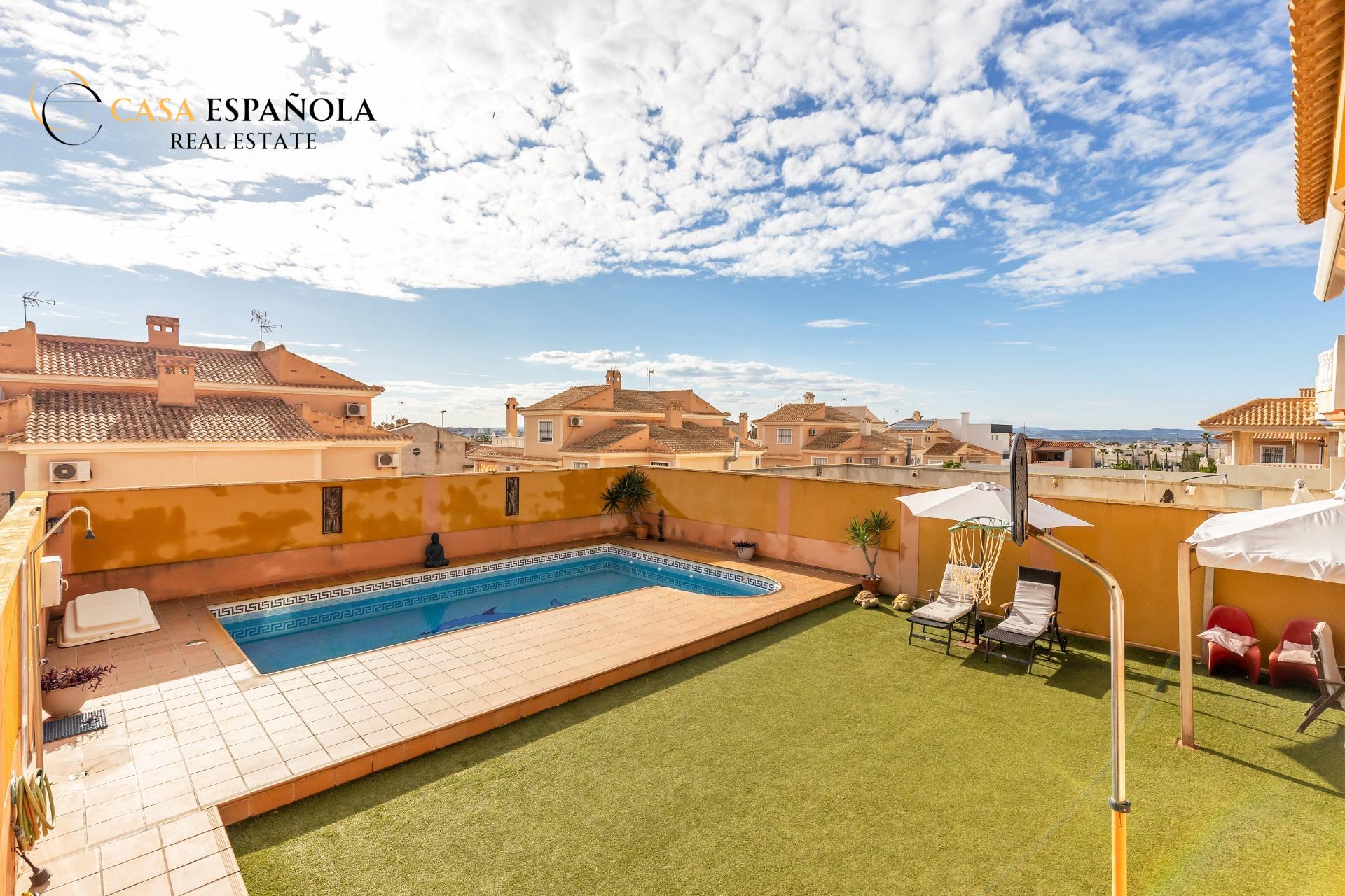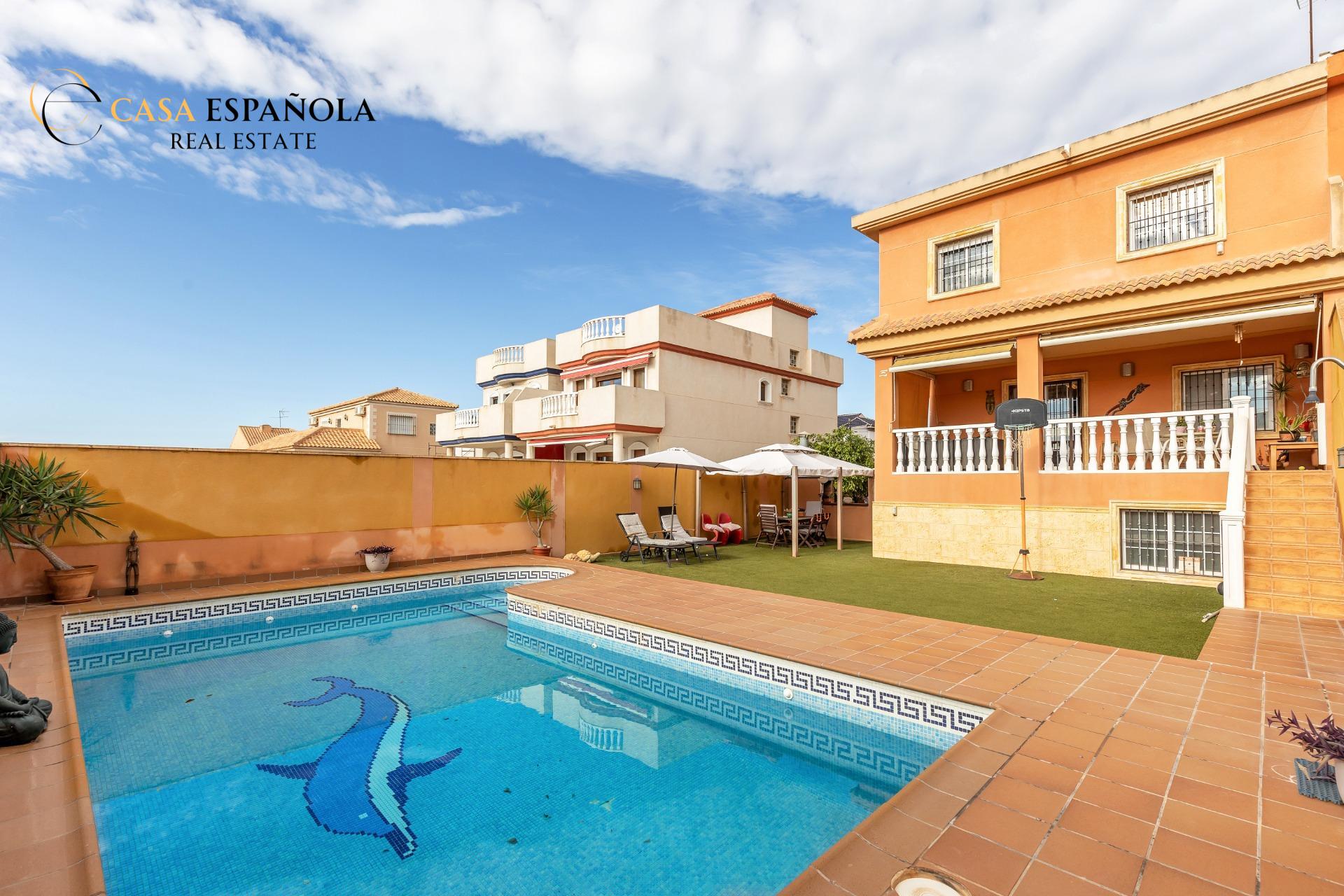 We presenteren u deze indrukwekkende woning in een van de meest exclusieve en rustige gebieden van Aguas Nuevas, perfect voor gezinnen die op zoek zijn naar comfort, ruimte en een uitstekende locatie dicht bij scholen en voorzieningen.~~Met een royaal perceel op het zuiden biedt deze woning met 4 tweepersoonsslaapkamers en 2 badkamers een praktische en functionele indeling:~~Begane grond: Volledig uitgeruste aparte keuken, een kamer die momenteel is ingericht als kantoor, een ruime en lichte woon-eetkamer en een complete badkamer.~~Eerste verdieping: Drie tweepersoonsslaapkamers, elk met toegang tot ruime inloopkasten, en een extra badkamer.~Kelder: Ruime garage met capaciteit voor 3-4 auto's, een multifunctionele ruimte ingericht als speelruimte voor kinderen en hun vrienden, en meerdere kasten die zorgen voor optimaal opbergruimte.~~Buitenruimte: Een unieke ruimte met een privézwembad, barbecuegedeelte, pergola en meerdere terrassen op zowel de begane grond als de eerste verdieping. Perfect om het hele jaar door van het buitenleven te genieten.~~De woning ligt in een centraal maar rustig gebied, met gemakkelijke toegang tot bussen, supermarkten, winkelcentra, medische centra, scholen, parken en andere voorzieningen. Bovendien ligt het slechts enkele minuten van de kust, golfbanen en ziekenhuizen.